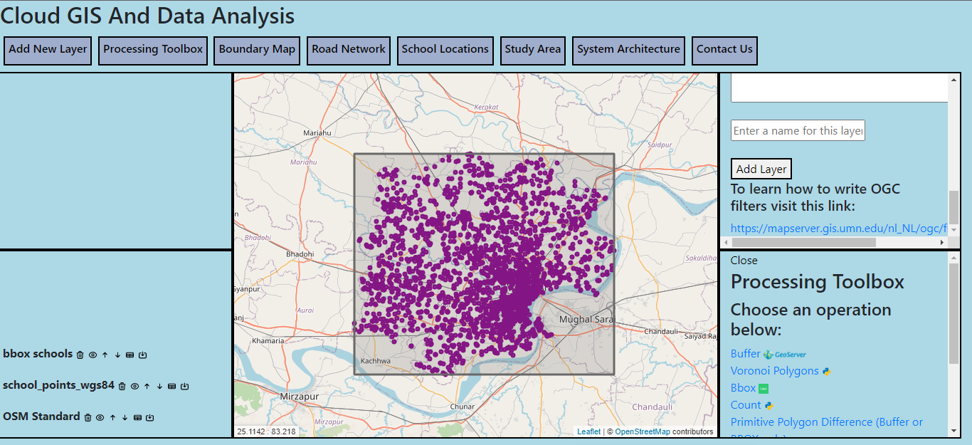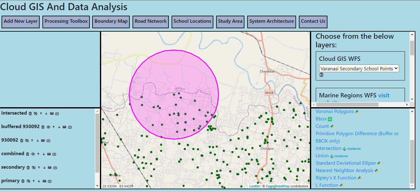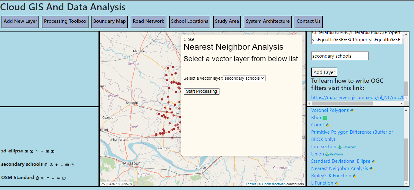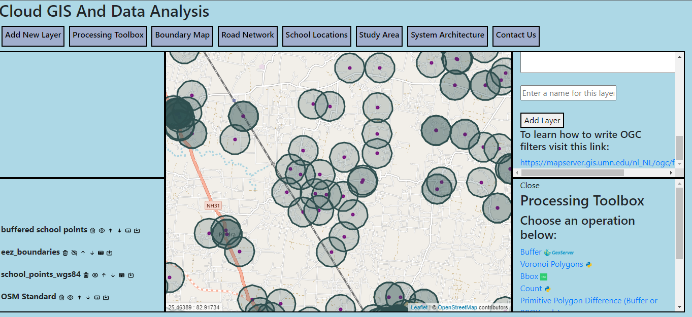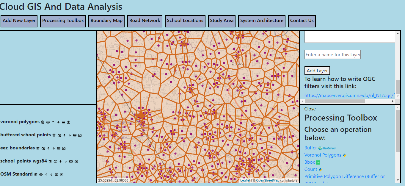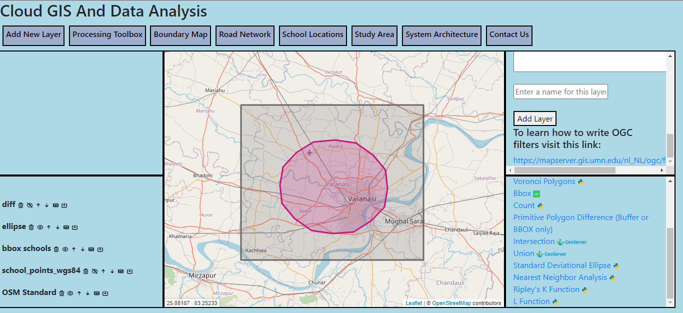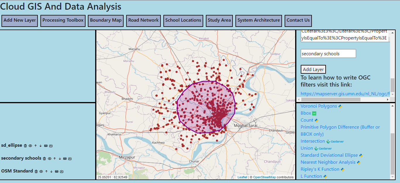 This is a web GIS that has been hosted on AWS cloud platform. There is a separate Geoserver associated with this. This GIS application can be mainly used to perform data analysis and spatial knowledge discovery tasks. The backend uses PHP and Python to process datasets and generate results and graphs using matplotlib. This application was used for two research papers which are under the process of publication.
