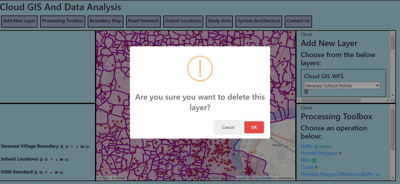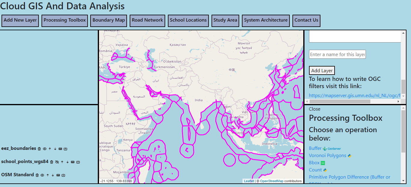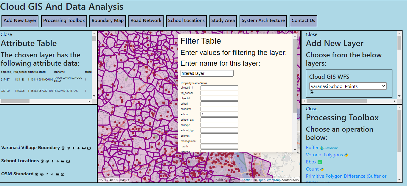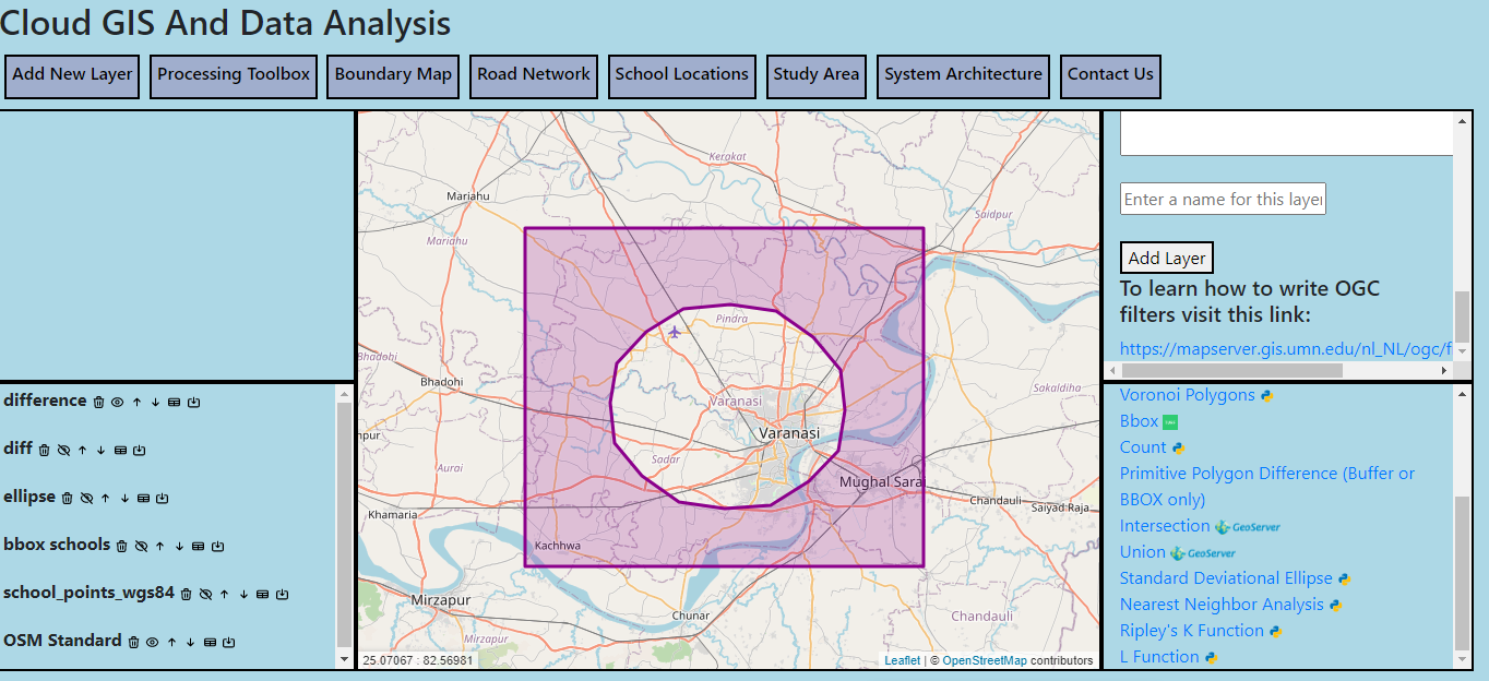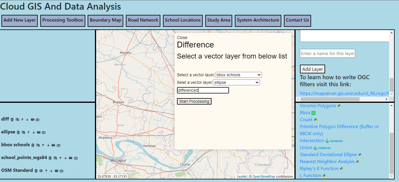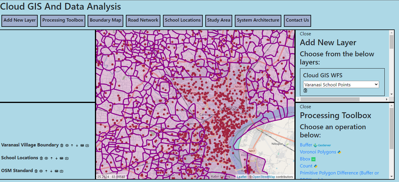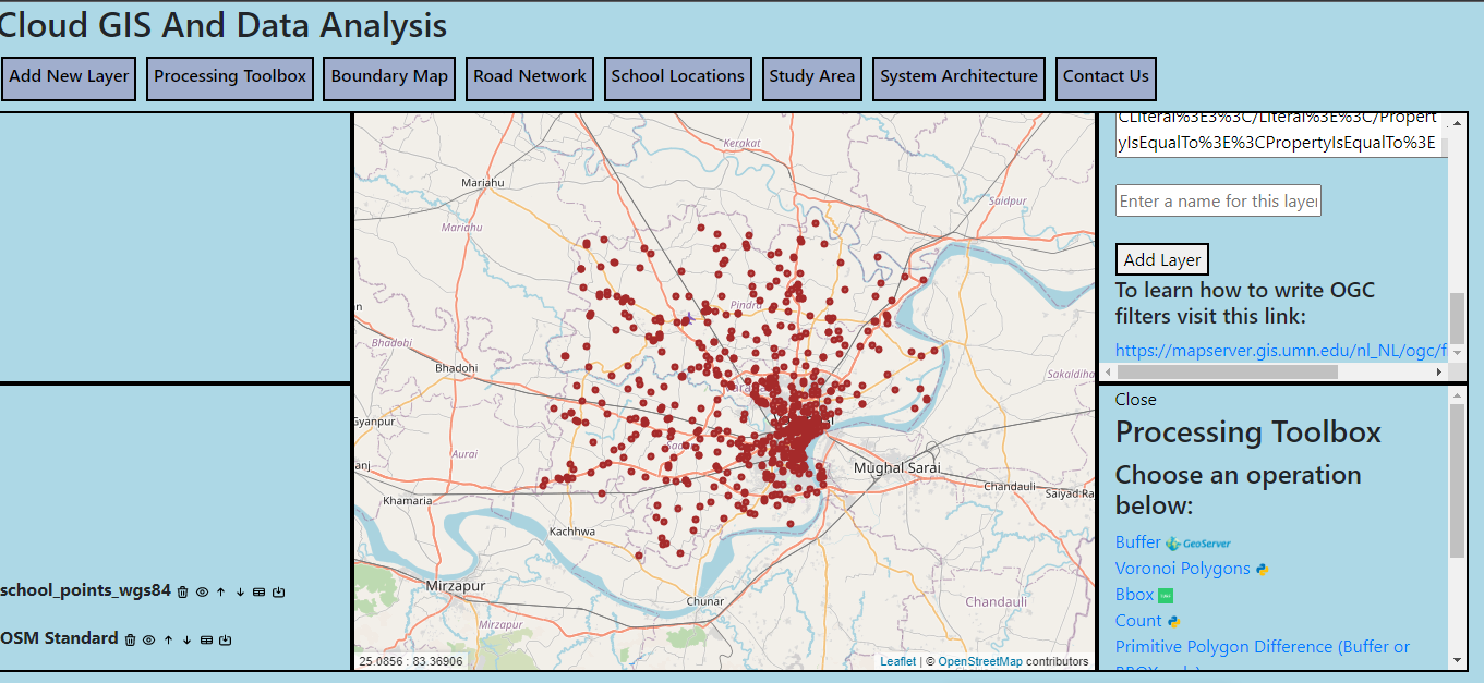 This is a web GIS that has been hosted on AWS cloud platform. There is a separate Geoserver associated with this. This GIS application can be mainly used to perform data analysis and spatial knowledge discovery tasks. The backend uses PHP and Python to process datasets and generate results and graphs using matplotlib. This application was used for two research papers which are under the process of publication.